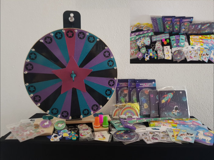 Glücksräder sind immer DER Hit und unser Glücksrad ist handlich, platzsparend und glitzert auch noch! Daran kann kein Kind vorbeigehen. Wir kommen mit unserem Glücksrad zu Ihrem Event und führen die Aktion vor Ort für Sie durch. Auf Wunsch haben wir auch bereits die Gewinne (kleine Spielzeuge) im Gepäck. Natürlich können Sie auch Gewinne aus Ihrem Give-Away Repertoire zur Verfügung stellen oder ein Mix aus beidem ist möglich.